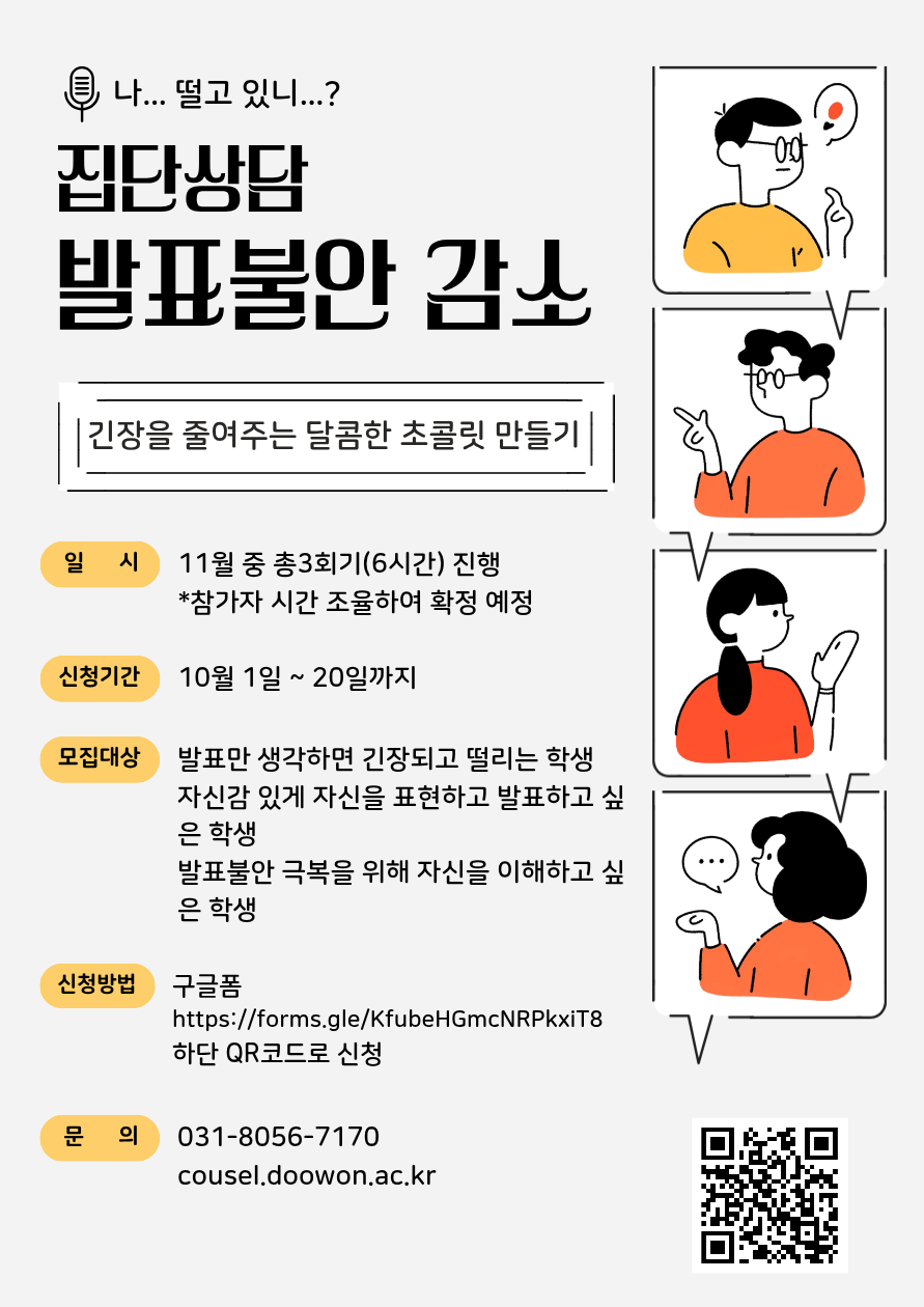 발표를 앞두고 긴장되고 불안한 재학생을 대상으로 발표불안을 감소하고 이완할 수 있는 프로그램을 운영합니다.
