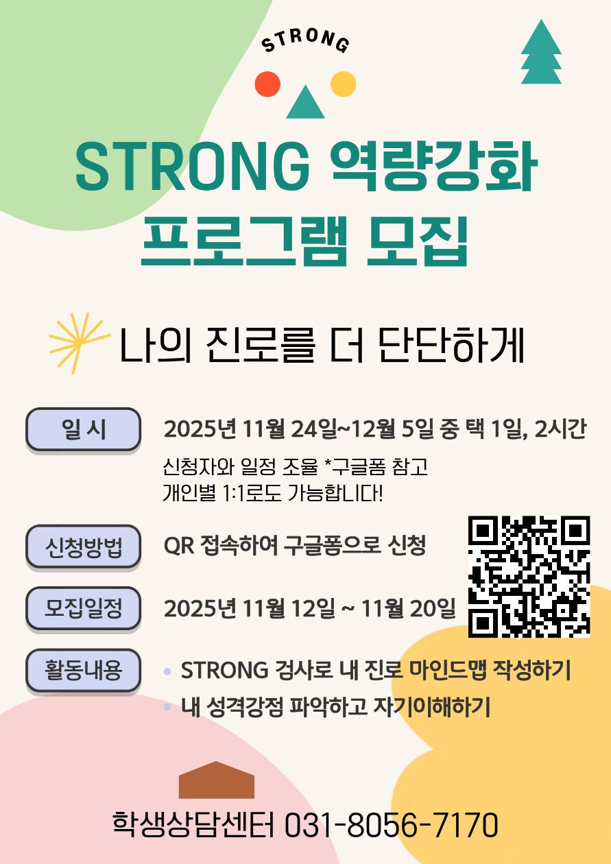 학생상담센터에서는 재학생들의 자기이해와 학업 및 진로탐색을 돕는 심리검사와 해석특강을 제공하고자 합니다. 관심 있는 두원인 여러분을 환영합니다!
