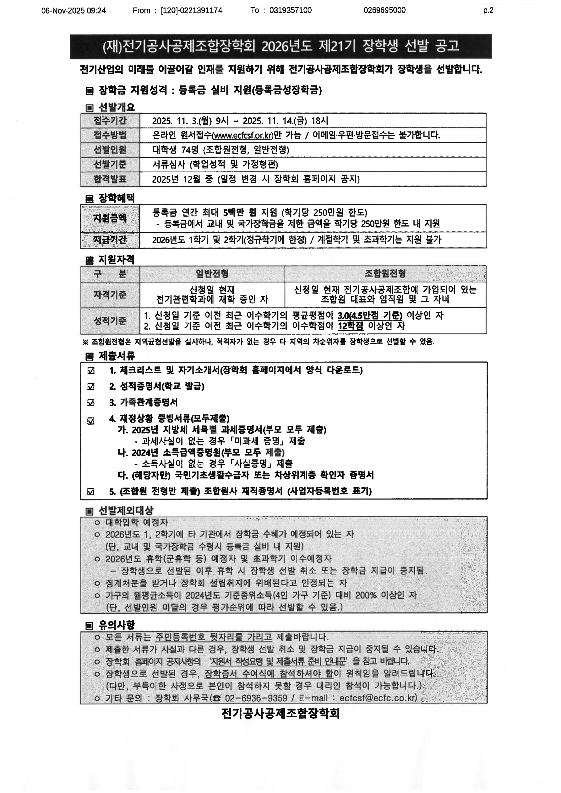 2026년도 전기공사공제조합장학회 제21기 장학생 선발 안내